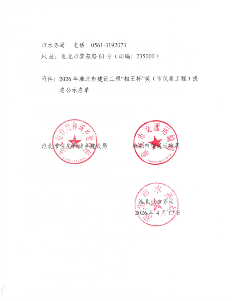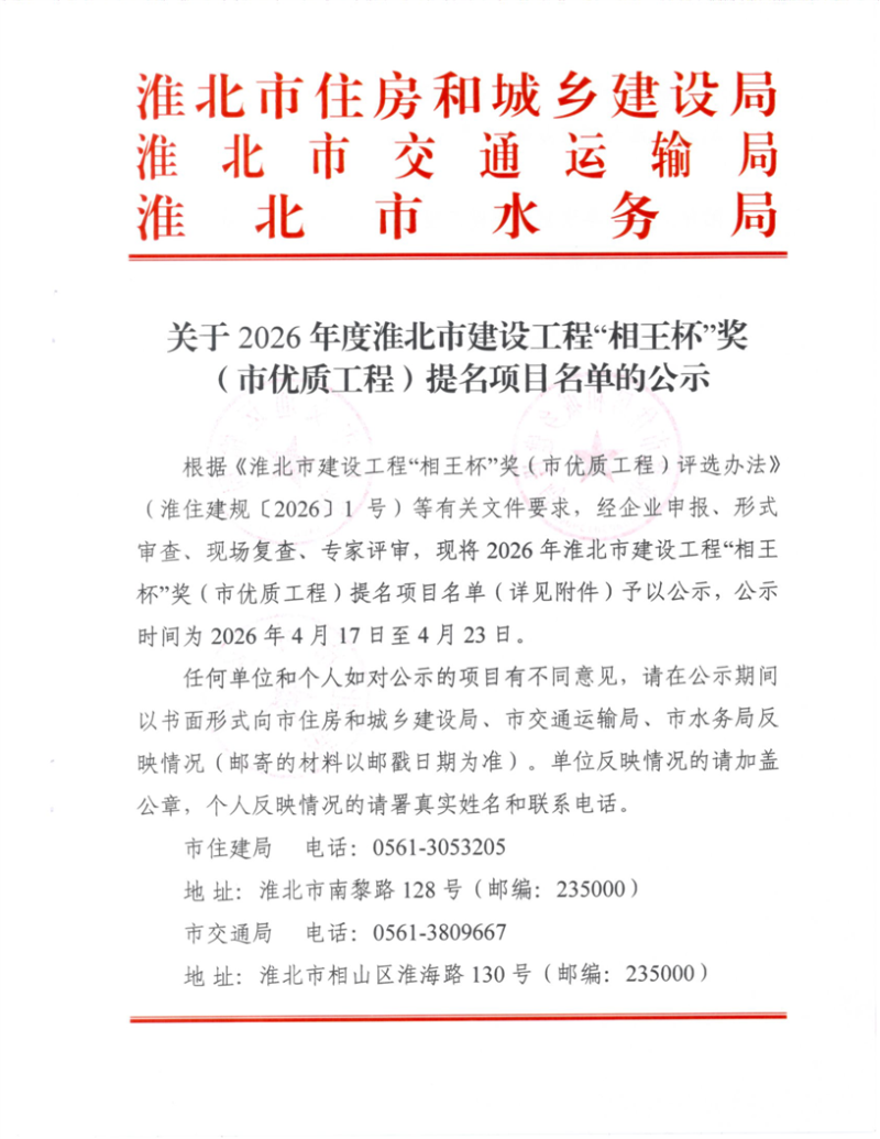 关于2026年度淮北市建设工程“相王杯”奖(市优质工程)题名项目名单的公示